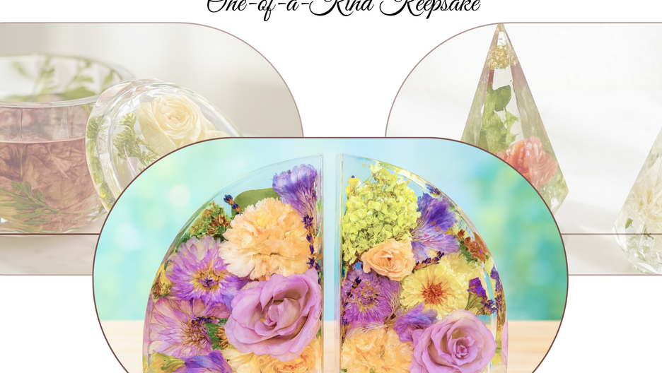 Preserve the beauty of your flowers forever with Handmade by Theia. Whether it’s a wedding bouquet, memorial flowers, or a special arrangement, I turn your blooms into timeless resin keepsakes like bookends, trays, and bowls.