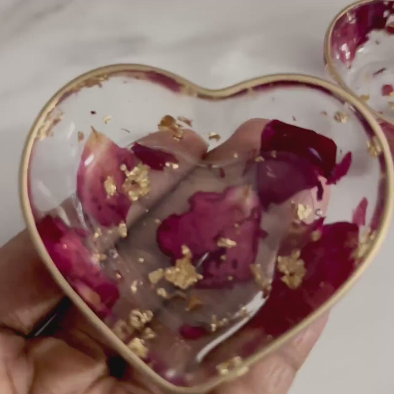 Heart-Shaped Resin Ring Dish – Pressed Rose Petals & Gold Flakes – Gift Boxed Jewelry Holder